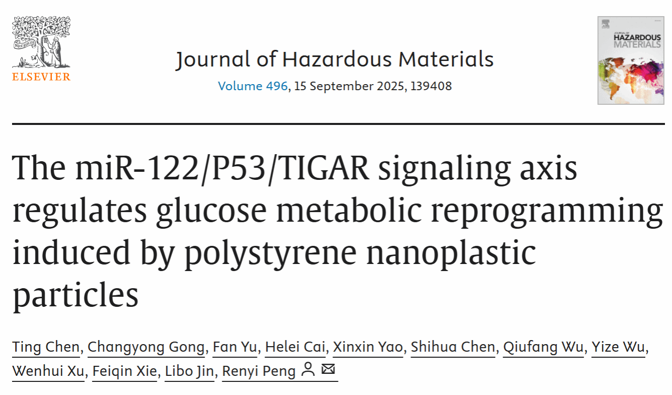 近日,中欧网页版生命与环境科学学院彭仁义课题组在中科院一区期刊《Journal of Hazardous Materials》(IF=11.3)发表了题为“The miRNA-122/P53/TIGAR signaling axis regulates glucose metabolic reprogramming induced by polystyrene nanoplastic particles”最新研究。该研究聚焦聚苯乙烯纳米塑料(PS-NPs)污染这一全球性威胁,深入探究其通过靶向miRNA-122对糖代谢重编程的复杂影响机制。