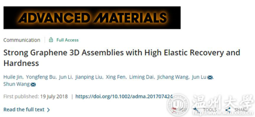日前,我校化学与材料工程王舜课题组金辉乐博士在三维石墨烯方向取得研究新进展,研究成果以“Strong Graphene 3D Assemblies with High Elastic Recovery and Hardness”为题在线发表于《先进材料》。