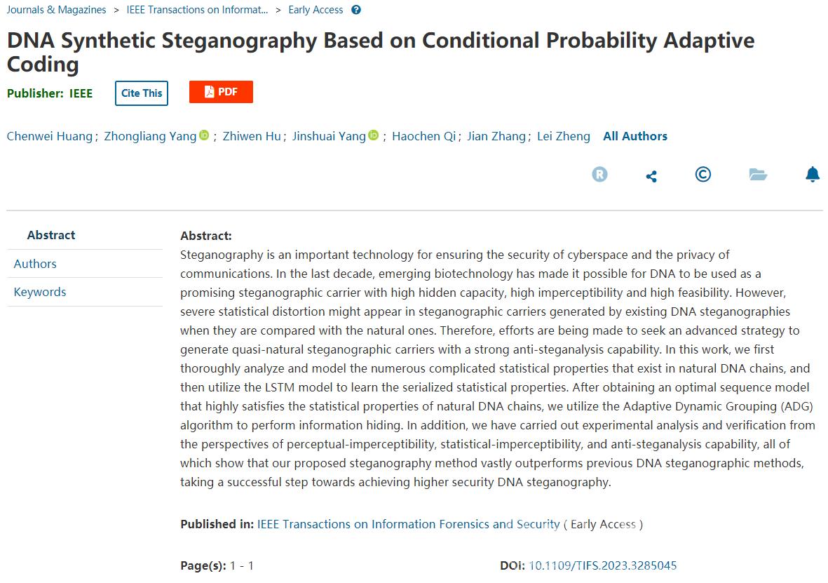针对目前DNA隐写术的统计失真问题,我校电气与电子工程学院张鉴教授课题组与北京邮电大学、合肥工业大学等团队深度合作,提出了一种基于序列建模及条件概率自适应编码的序列生成式DNA隐写术,利用循环神经网络与长短期记忆神经元模型建模并学习原始天然DNA载体中的统计分布特征。获得高保真序列模型后,通过自适应动态分组算法生成与天然DNA载体高度相似的隐写载体。重复的抗隐写分析实验表明所生成的DNA隐写载体显著提升了抗隐写分析能力,可有效抵抗来自最先进神经网络隐写分析术的侦测。同时,课题组还针对统计-不可感知性提出了两种全新的评价方法,建立了DNA隐写中不可感知性的统一评价体系。