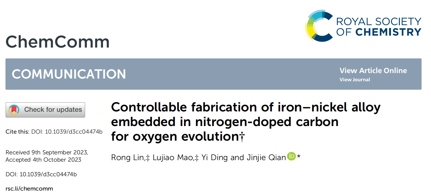 本论文以“Controllable fabrication of iron-nickle alloy embedded in nitrogen-doped carbon for oxygen evolution”为题发表在被自然指数收录的国际著名期刊《Chemical Communications》上。中欧网页版为第一通讯单位,我校化材学院钱金杰副教授为通讯作者,化材学院21级本科生林荣、21级研究生毛璐娇为共同一作,21级本科生丁奕参与了该项工作。该工作受到国家自然科学基金(21601137)、浙江省自然科学基金(LQ16B010003)、浙江省温州市基础科技研究项目(H20220001)的资助。