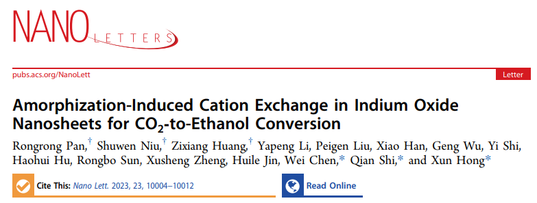 我校化材学院陈伟、时茜教授课题组和中国科学技术大学洪勋教授课题组在国际知名期刊《Nano Letters》发表题为“Amorphization-induced cation exchange in indium oxide nanosheets for CO2-to-ethanol conversion”的论文。该工作在理论计算的指导下,以无定形In2O3纳米片(a-In2O3 NSs)为主体材料,在室温下与多种客体阳离子进行CE反应。密度泛函理论(DFT)计算表明,无定形纳米材料中丰富的配位-不饱和金属位点对于突破CE反应的能垒以调控金属氧化物的组成至关重要。