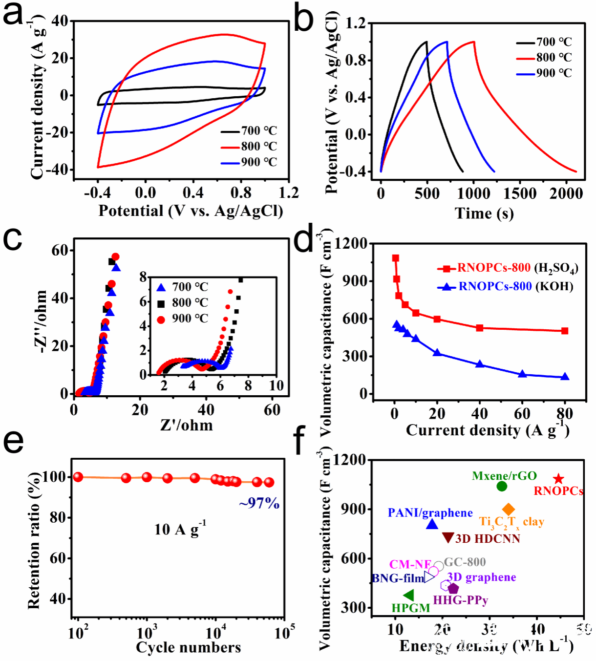 RNOPCs材料在0.5 H2SO4电解液中在稳定电压窗口可达1.4 V,其中RNOPCs-800电极在1 A g-1电流密度下的体积比电容高达1084 F cm-3,在10 A g-1下循环60000圈后的电容保持率高达97%。将RNOPCs-800电极组装成对称超级电容器,其能量密度高达54.3 Wh L-1。该工作中RNOPCs-800在酸性电解液中的体积比电容(1084 F cm-3)和能量密度(54.3 Wh L-1)高于目前所报道的所有碳基超级电容器。