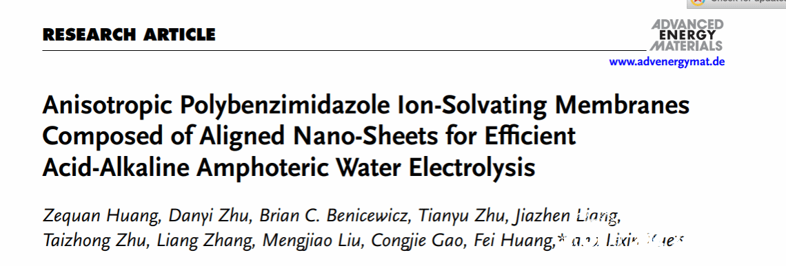 文章链接:“Anisotropic Polybenzimidazole Ion-Solvating Membranes Composed of Aligned Nano-Sheets for Efficient Acid-Alkaline Amphoteric Water Electrolysis”