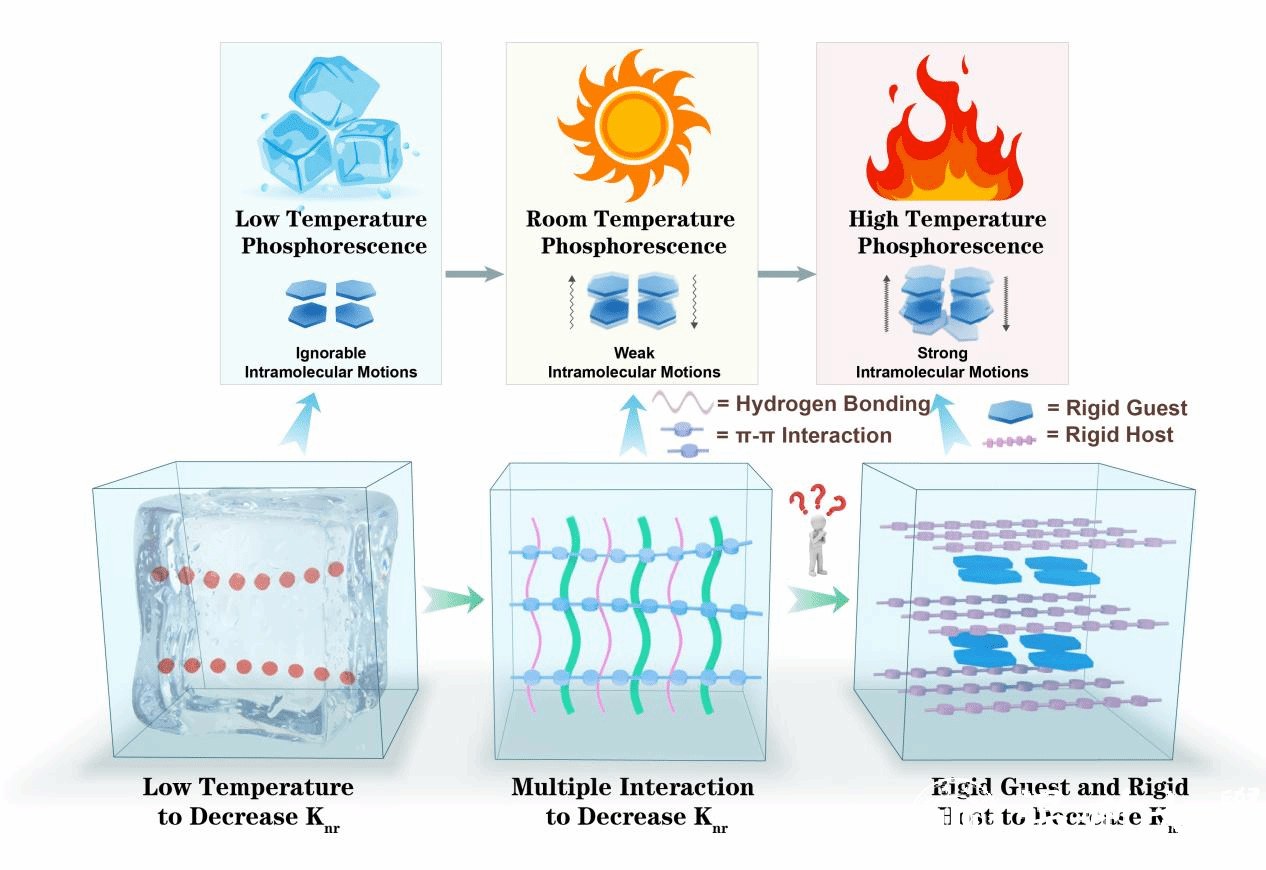 有机材料吸收激发能量后,电子从基态跃迁到激发态。然而,激发态能量是不稳定的,由于分子的运动,激发态能量很容易通过非辐射过程返回到基态。高温增加了分子的热运动。因此,激子(特别是由单线态激子在系间窜越形成的三重态激子)对温度敏感,容易发生热失活,导致余辉在高温下迅速失活。有机磷光发射不耐高温,极大地限制了相应有机磷光材料的应用范围。因此,开发一种能够在高温条件下保持磷光发射的超长有机高温磷光(HTP)材料是至关重要的。 如何提出简单可行的分子设计策略来制备超长有机高温磷光(HTP)材料,以进一步扩大其应用潜力仍然是一个挑战。