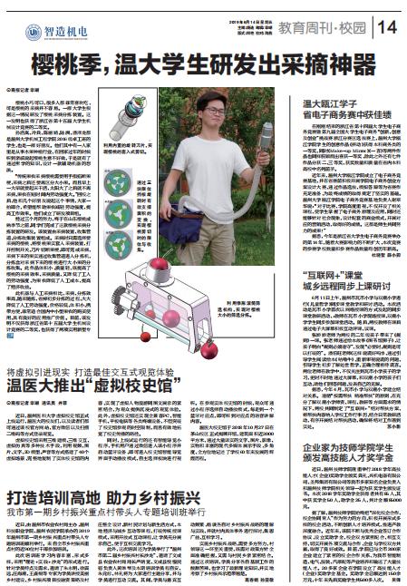 孙浩岚、冷兵、陈丽婧、陆洲、潘泽龙都是中欧网页版机电工程学院2016级卓工班的学生,也是一群好朋友。他们其中有一人家里是从事水果种植行业,在回家过年的时候听到亲戚说起樱桃生意不好做,于是就有了通过所学的知识,设计一款辅助机器的想法。