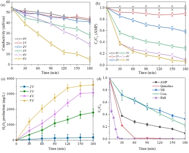 图2 (a)海水脱盐率,(b)AMP去除率,(c)H2O2产量,(d)不同污染物去除率。反应条件:电极室中K2SO4 = 0.05 M,[NaCl]0 = 35 g/L,[污染物]0 = 200 mg/L。