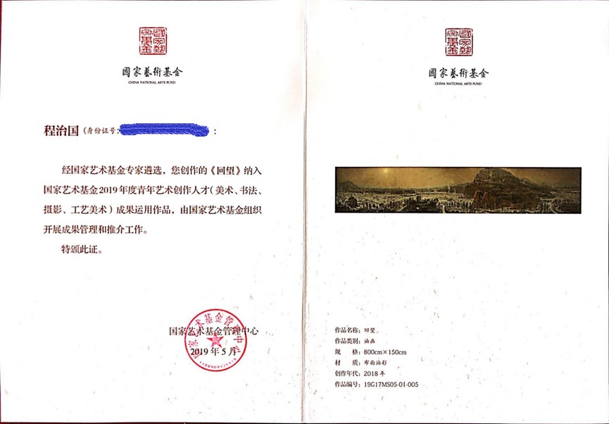2017年,程治国老师的《回望》获得国家艺术基金青年艺术创作人才立项资助。耗时近两年完成的作品,宽8米、高1.5米,以中国绘画特有的“长卷式”表现了中国当代人对于黄土高原、黄土文化的深沉情感。作者运用浑厚细腻的写实手法刻画看似平常的北方乡野,以坚实造型营构出气象博大的自然山水,给观者以凝重的历史感。凭借对中西绘画传统的领悟和对当代生活的特殊体验,及对油画语言的驾驭和探求,该作品获得专家高度肯定。此次国家艺术基金成果运用作品是从近年来结项的美术类项目(含绘画、书法、雕塑、摄影等)共3904件中遴选,最终油画、水彩(粉)画类中产生32件作为“成果运用作品”。