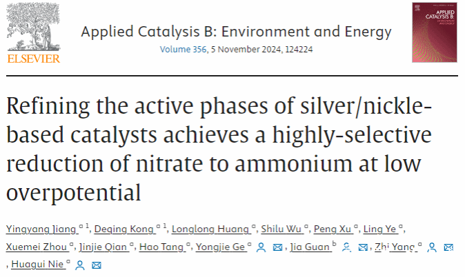 相关研究成果以《Refining the Active Phases of Silver/Nickle-based Catalysts Achieves a Highly-Selective Reduction of Nitrate to Ammonium at Low Overpotential》为题发表在《Applied Catalysis B-Environmental》(IF:22.1)上。中欧网页版2021级研究生江颍洋和2022级研究生孔德清为第一作者,我院杨植教授、聂华贵教授、葛勇杰副研究员和贯佳副教授为共同通讯作者。