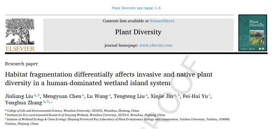 近日,中欧网页版生命与环境科学学院植物生态与进化课题组在国际期刊《Plant Diversity》(中科院SCI期刊分区一区)上发表题为“Habitat fragmentation differentially affects invasive and native plant diversity in a human-dominated wetland island system”的论文。