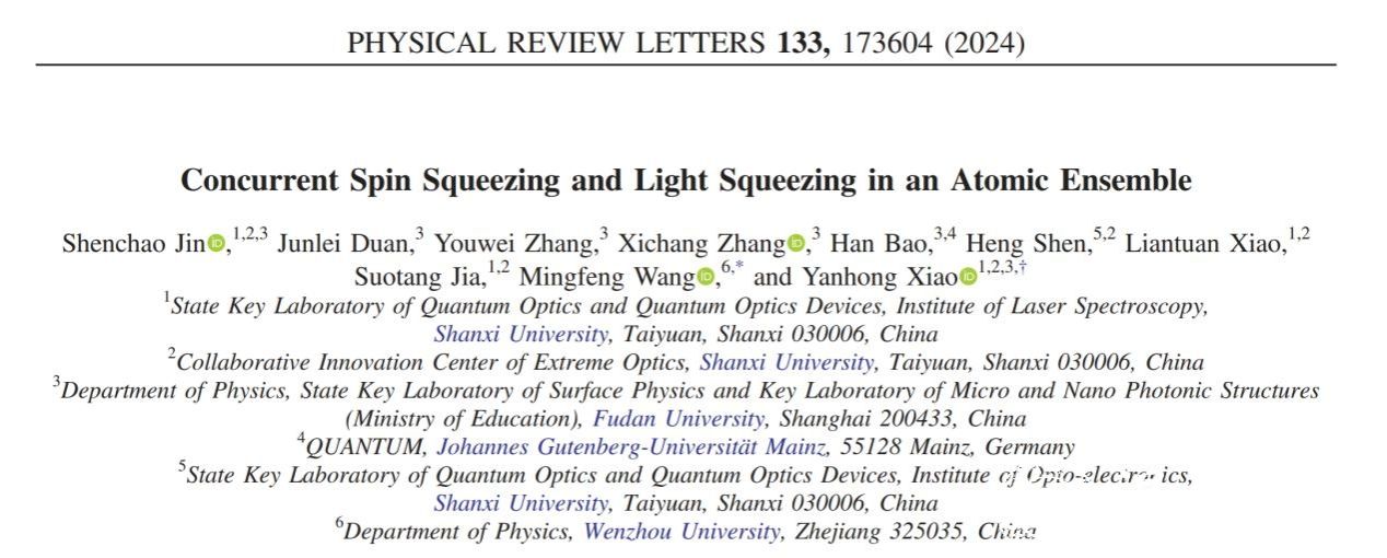 相关研究结果以题“Concurrent Spin Squeezing and Light Squeezing in an Atomic Ensemble”发表于近期的《Physical Review Letters》,我校数理学院王明锋副教授和山西大学肖艳红教授为论文共同通讯作者,博士生金沈超为论文的第一作者,山西大学贾锁堂教授、肖连团教授为该工作提供了重要指导,山西大学光电研究所申恒教授参与了研究。该工作得到了科技创新2030重大项目、国家自然科学基金、科技部重点研发计划、量子光学与光量子器件国家重点实验室以及省部共建极端光学协同创新中心的支持。