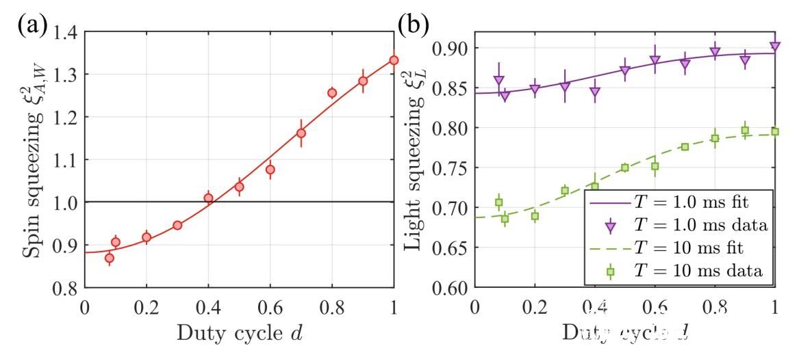 图2. (a) 原子自旋压缩度与脉冲占空比的关系图(占空比是指单个小脉冲长度与频闪周期的比值);