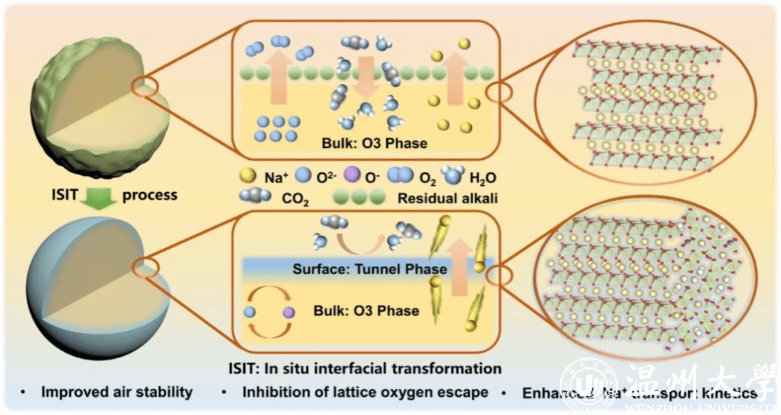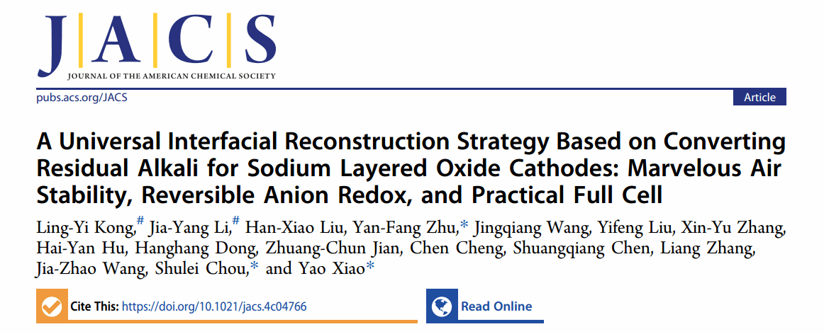 该成果以“A Universal Interfacial Reconstruction Strategy Based on Converting Residual Alkali for Sodium Layered Oxide Cathodes: Marvelous Air Stability, Reversible Anion Redox, and Practical Full Cell”为题,发表在国际顶级期刊《Journal of the American Chemical Society》上,中欧网页版为第一通讯单位,我院硕士研究生孔令益和University of Wollongong的博士研究生李佳阳为共同第一作者。