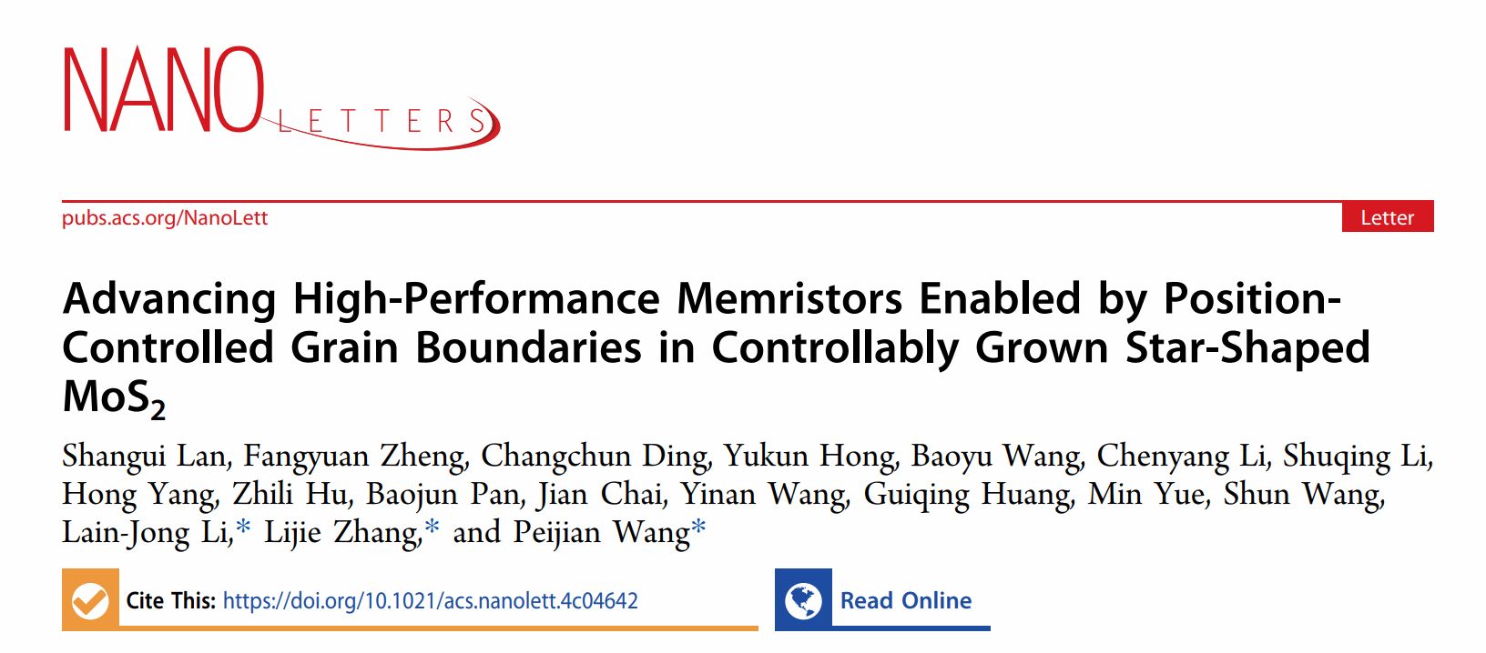 该工作以“Advancing High-Performance Memristors Enabled by Position-Controlled Grain Boundaries in Controllably Grown Star-Shaped MoS2”为题发表在国际纳米顶尖期刊《Nano Letters》上。中欧网页版为第一通讯单位,化材学院王佩剑副教授和张礼杰教授为通讯作者。本研究工作得到温州市基础科学研究项目(G20240021)、国家自然科学基金委(51902061, 62090031, 52072272)资助完成。