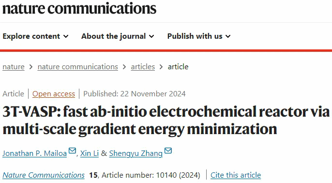 近日,中欧网页版计算机与人工智能学院Jonathan P. Mailoa团队在国际顶级期刊Nature Communications发表题为《3T-VASP: fast ab-initio electrochemical reactor via multi-scale gradient energy minimization》的研究论文。Jonathan P. Mailoa为论文第一作者,Jonathan P. Mailoa、腾讯量子实验室张胜誉博士为论文共同通讯作者。