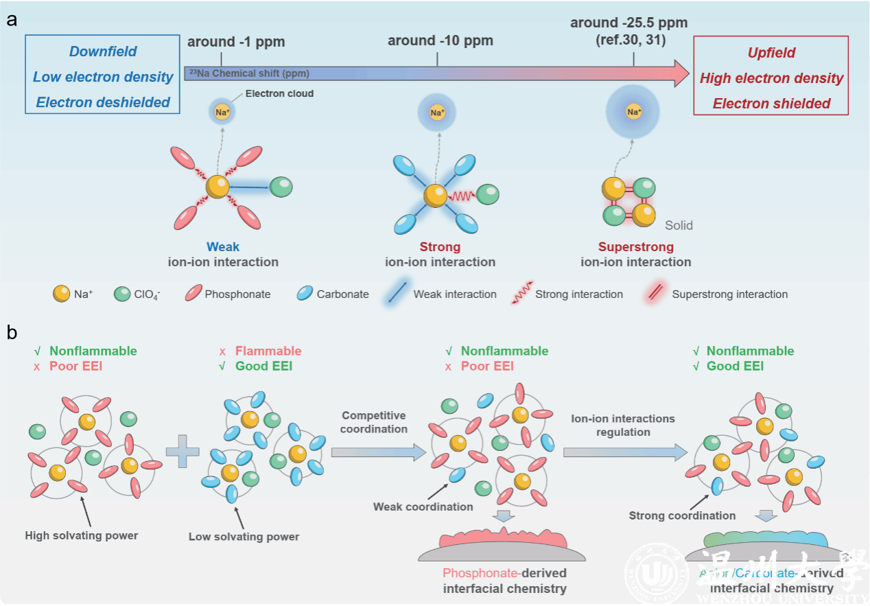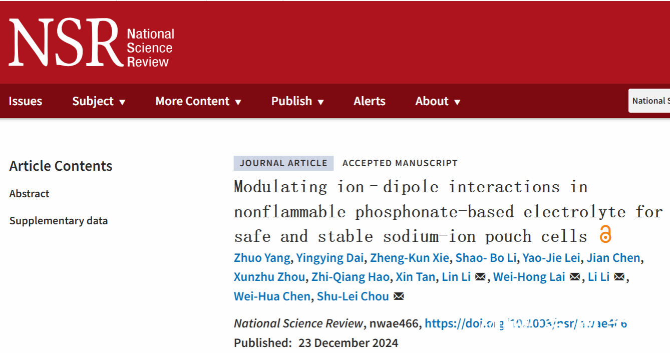 近日我校化材学院李林特聘教授团队联合复旦大学赖伟鸿研究员及上海大学李丽教授在国际权威期刊National Science Review上发表题为《Modulating Ion-Dipole Interactions in Nonflammable Phosphonate-Based Electrolyte for Safe and Stable Sodium-Ion Pouch Cells》的学术论文,这也是我校首次在该期刊上发表论文。在本研究中通过阳离子-阴离子间相互作用的调节以及分子空间位阻的差异,选择性增强低溶剂化能配体分子在Na+溶剂化壳层中的配位数,从而实现有利且可调的界面化学。基于此,作者将一系列低溶剂化能的碳酸酯分子(EC、PC、VC、DEC、EMC)分别引入到高溶剂化能的磷酸酯(TEP)溶剂中,通过增强Na+阳离子与ClO4-阴离子之间的相互作用,选择性的提高了低溶剂化能的碳酸酯分子的竞争配位能力,促使形成富含碳酸酯分子的溶剂化结构,最终构筑了以碳酸酯分子分解为主的稳定界面化学。得益于此,该电解液设计解锁了低溶剂化能分子在溶剂化壳层中较弱竞争配位能力的限制,构建了一种低成本、完全无氟且阻燃的电解液,使得普鲁士蓝||硬碳软包电池在高负载量条件下(正极:20 mg/cm-2;负极:12 mg/cm-2)循环50圈后,仍有高达96%的容量保持率,展示了巨大的实际应用潜力。相关文章发表在National Science Review上,中欧网页版为第一通讯单位,第一作者曾是我院联培生杨卓,目前在复旦大学攻读博士学位,我院侴术雷教授,李林特聘教授以及复旦大学赖伟鸿研究员、上海大学李丽教授为共同通讯作者,相关工作受到国家自然科学基金,浙江省自然科学基金,国家电网科技项目以及温州自然科学基金的资助。