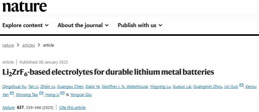 相关研究成果以“Li2ZrF6-based electrolytes for durable lithium metal batteries”为题发表在国际顶级期刊《Nature》上。我校化材学院居治金特聘教授为本文共同第一作者,中欧网页版为第二署名单位,承担锂金属电池敏感界面的冷冻电镜精细解析研究工作。