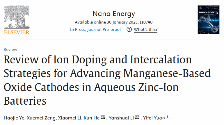 该综述论文以“Review of ion doping and intercalation strategies for advancing manganese-based oxide cathodes in aqueous zinc-ion batteries”为题发表于纳米能源领域国际顶级期刊⟪ Nano Energy ⟫(IF=16.8,中科院一区)。中欧网页版为第一通讯单位,我校化材学院21级本科生叶浩洁为第一作者,我校化材学院袁一斐、李彦帅、何坤教授为通讯作者,相关工作得到了国家自然科学基金、浙江省杰出青年基金等项目的资助。