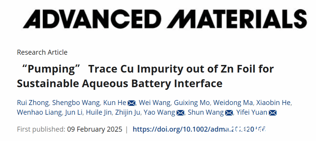 相关研究成果以“‘Pumping’ Trace Cu Impurity out of Zn Foil for Sustainable Aqueous Battery Interface”为题发表在国际顶级期刊《Advanced Materials》。我校为第一通讯单位,我校化材学院硕士研究生钟锐、浙江工业大学硕士研究生王盛博为共同第一作者,我校化材学院袁一斐、王舜、何坤教授,浙江工业大学王垚教授为共同通讯作者。