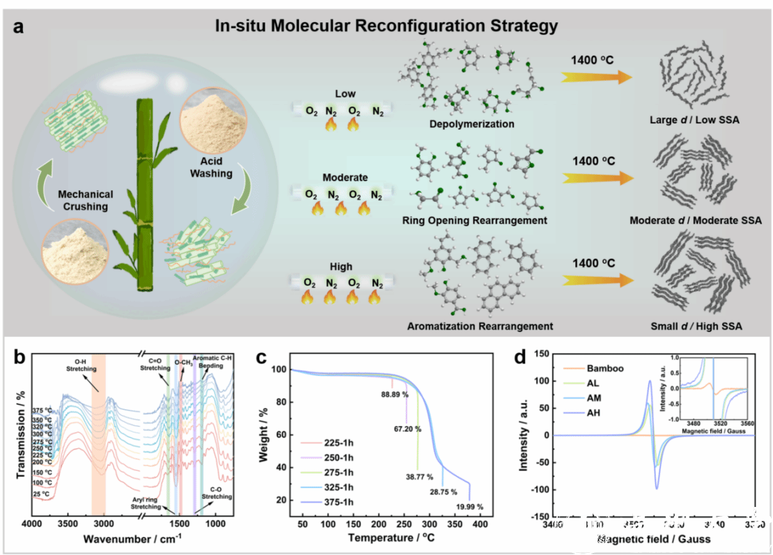 该工作通过密度泛函理论(DFT)耦合层间距、曲率和含氧缺陷三要素,建立“双关卡”模型。证明了层间距≥0.38 nm时,钠离子扩散能垒显著降低;曲率过大会阻碍传输。同时,含氧缺陷的弯曲石墨层可将钠吸附能优化至-2.0~-1.2 eV,提升可逆容量。