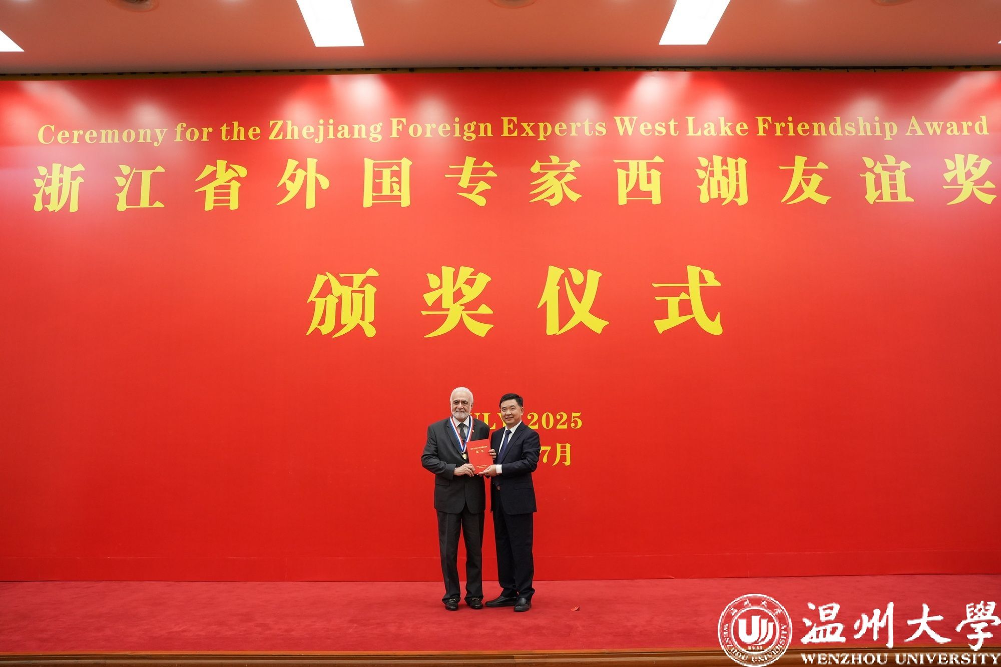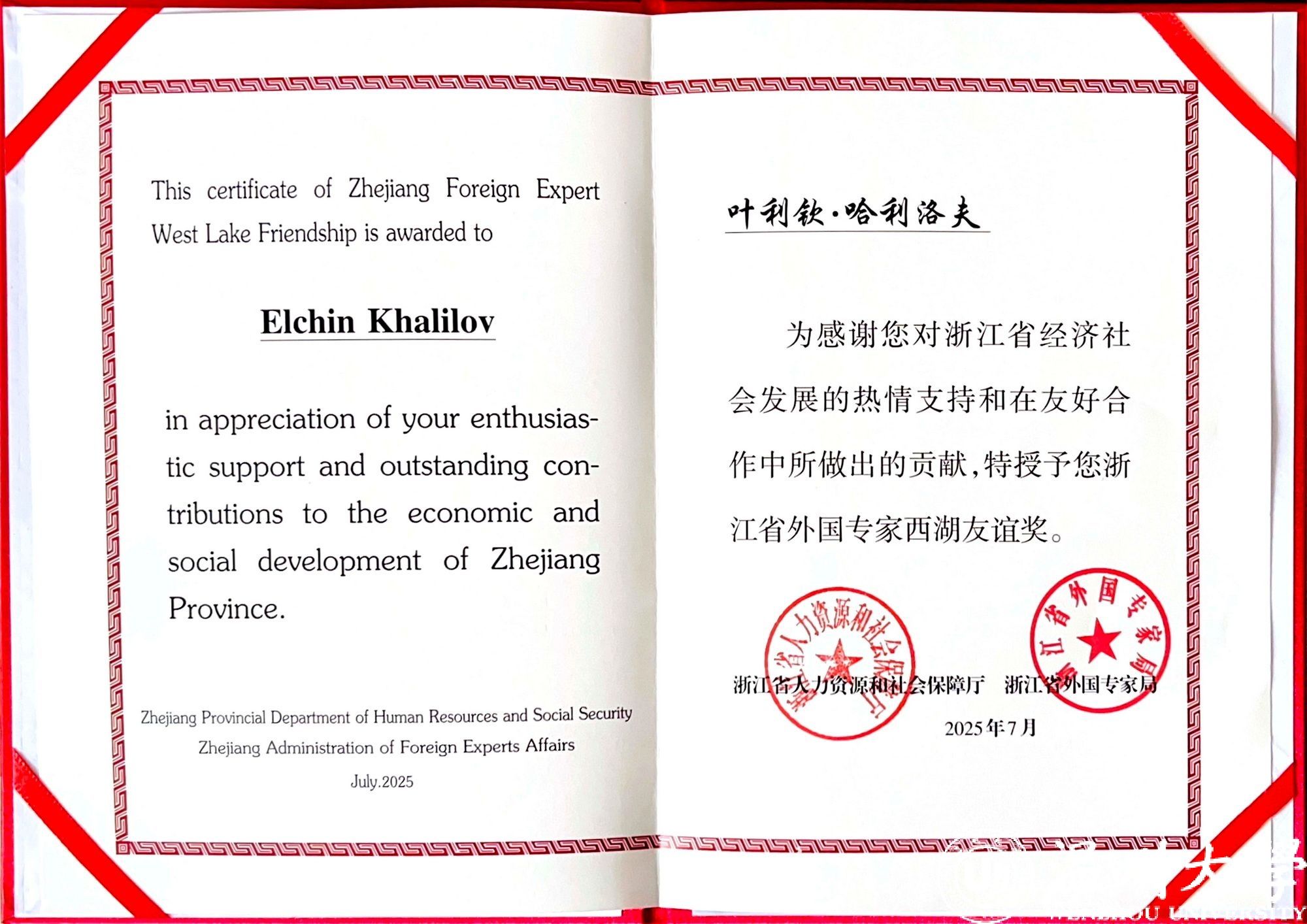 7月8日,浙江省外国专家西湖友谊奖颁奖仪式在省人民大会堂举行。我校叶利钦·哈利洛夫(Elchin Khalilov)教授应邀参会并获颁“西湖友谊奖”奖章与证书。会前,省领导会见了获奖专家并合影留念。