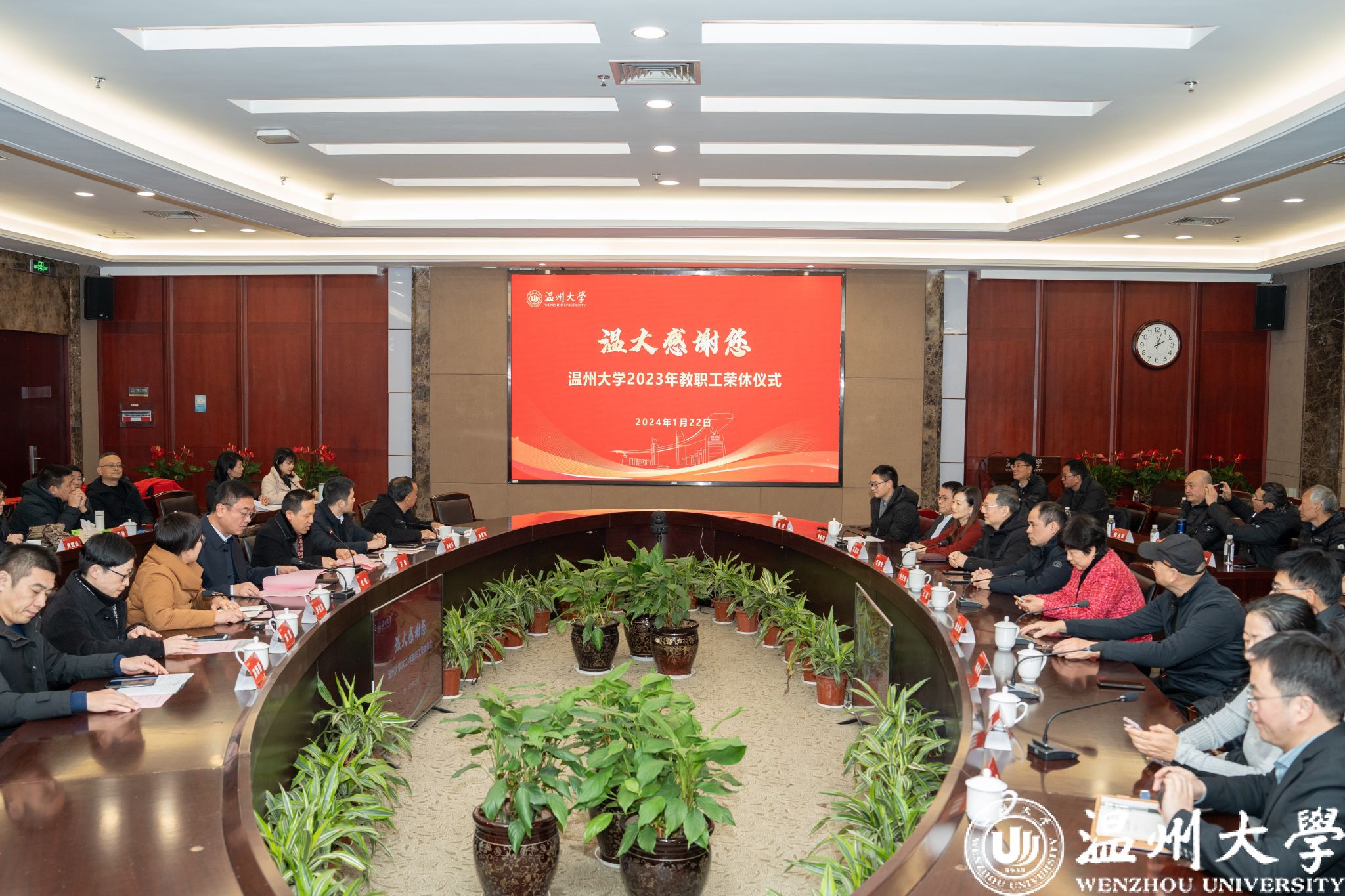 钱强作总结讲话。他代表学校向荣休教职工长期来为学校发展作出的贡献表示感谢。他指出,2023年在各位老师的见证和推动下,学校党建引领焕发新活力,人才培养取得新成果,人才引育实现新突破,中欧(中国)迈上新高度服务地方展现新作为,文化传承创新勇攀新高峰,离退休工作展现新面貌。他希望荣休教师继续发挥好政治优势、经验优势、人脉优势和威望优势,把红色精神、光荣传统、宝贵经验传承好,引领帮扶青年成长,继续为学校发展献计献策,为新时代新征程温大高质量发展传承薪火、凝聚力量、赋能增光。他表示,学校将做精服务、抓实关怀,建立健全退休教师关怀和服务机制,让每一位荣休教师都能切身享受到组织的温暖,真正实现生活幸福感更强,精神慰藉感更足。