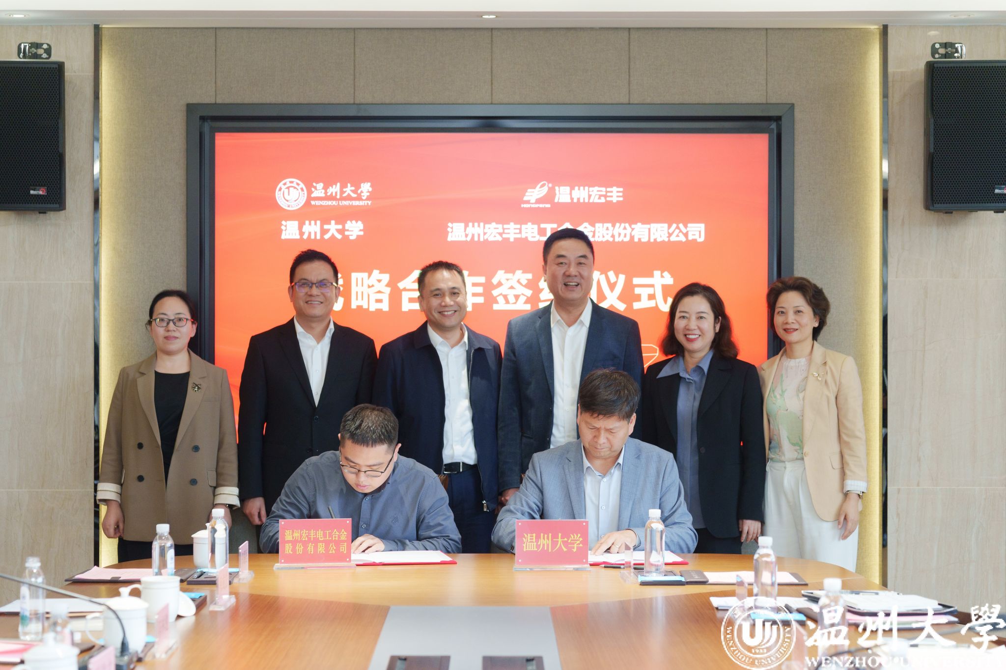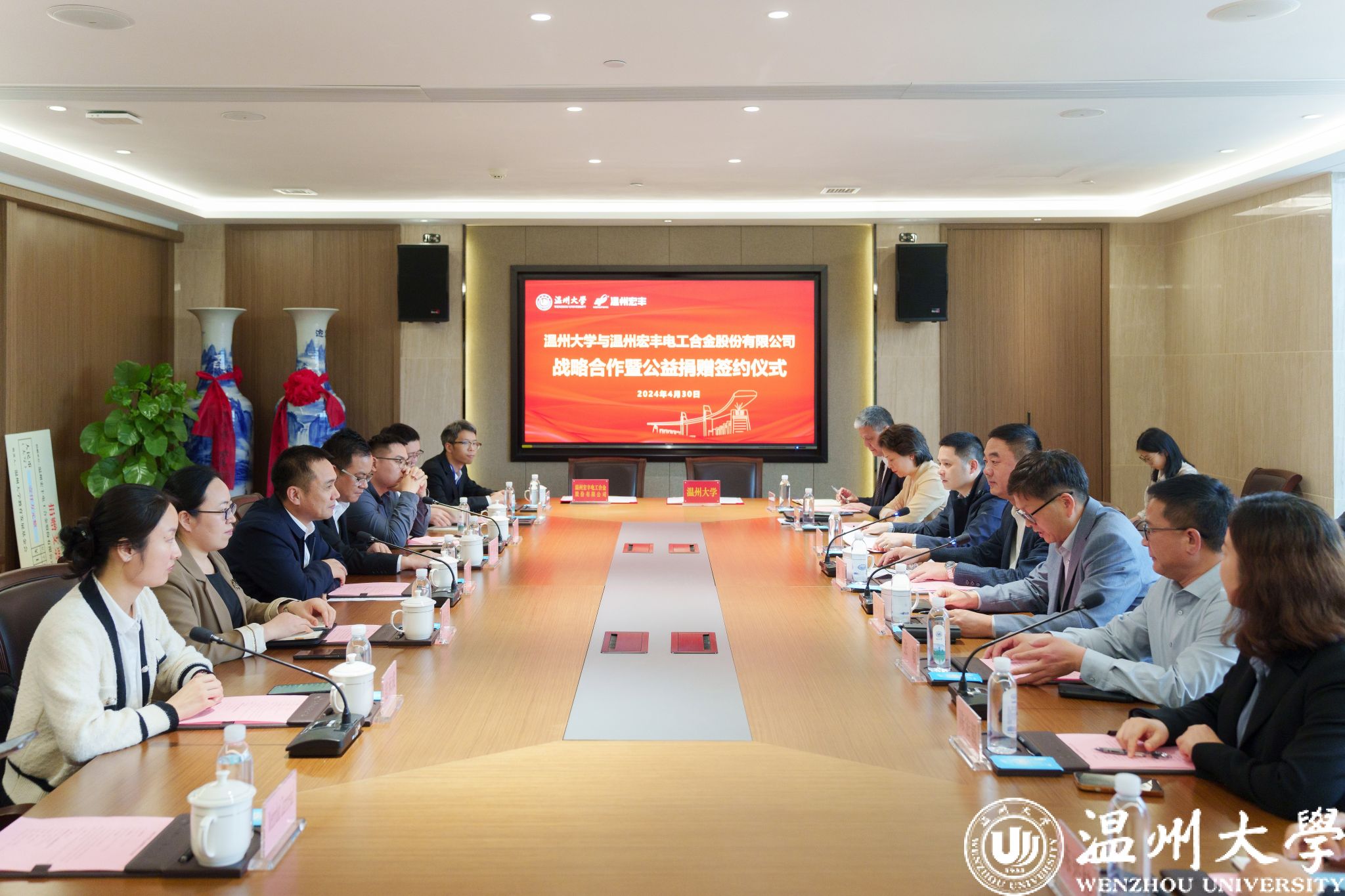 钱强介绍了学校建设发展情况。他指出,双方开展宽领域、多层次和深层次的战略合作,要深化校企融合,建立常态化联动机制,开展党建联盟、人才培养、科学研究等方面合作,共同促进双方优势互补、共赢发展;要助力人才培养,学校将严格按照捐赠协议内容,定向用好捐赠资金,为教师人才队伍建设、学生培养、校企产学研合作、国际交流等方面提供精准支持,促进教师发展和大学生成长成才;要服务产业发展,发挥高校学科专业齐全、人才智力集聚的特点,发挥温州宏丰产业领先、市场竞争的优势,开展前沿技术、新产品开发等领域的合作研究,共同推动新材料产业可持续发展,加快培育和发展新质生产力。