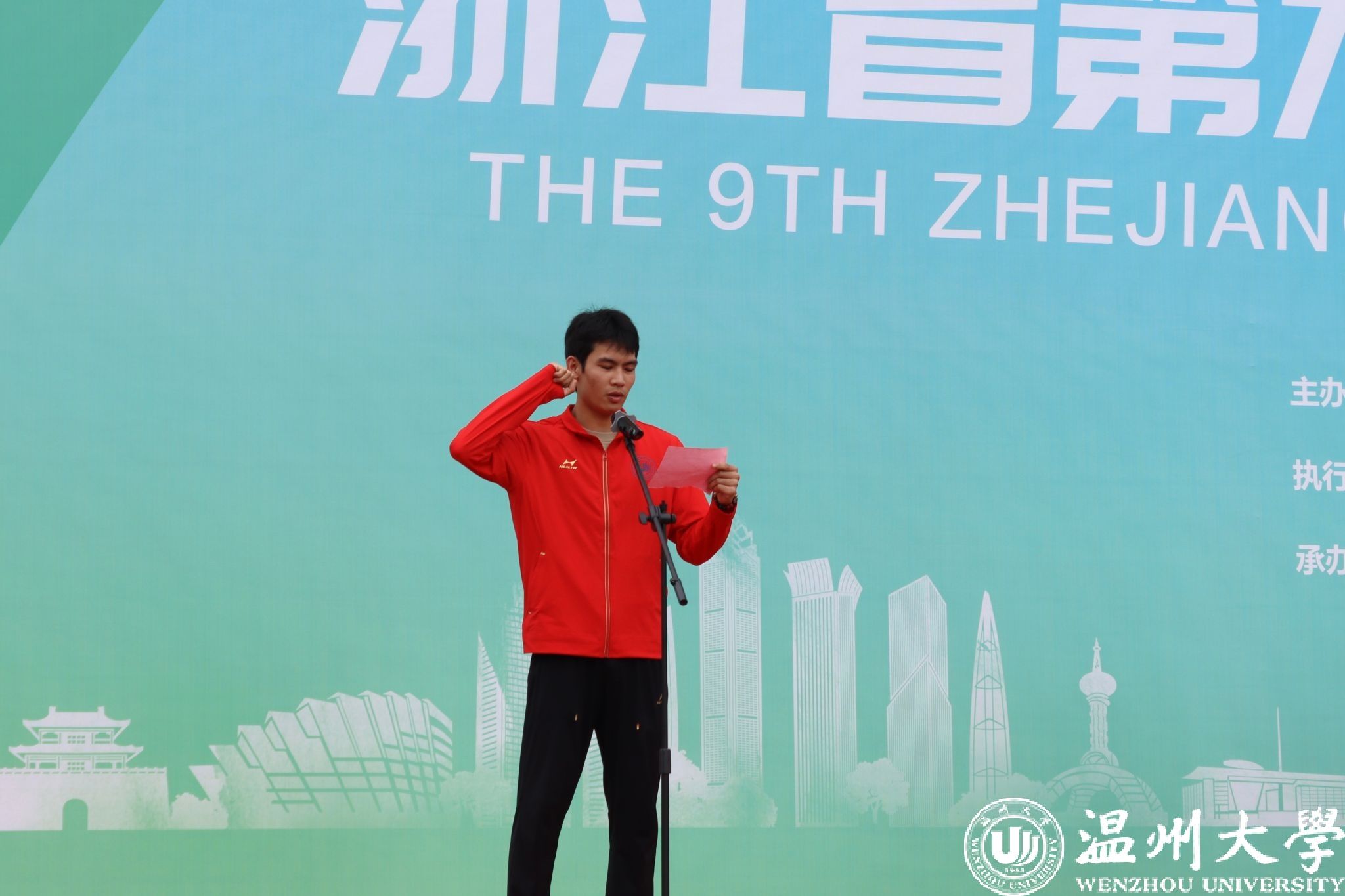 我校运动员代表林泽坚、裁判员代表翁士洋庄严宣誓。