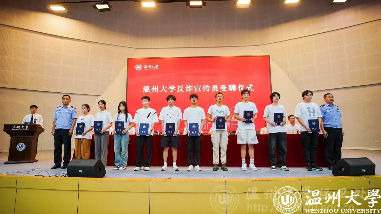 茶山派出所教导员张朝晖、温州市反诈中心警官刘昱洲为各学院学生代表颁发“中欧网页版反诈宣传员”聘书,并呼吁我校师生积极参与反诈宣传中,为平安温大贡献青春力量。