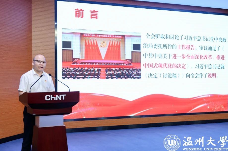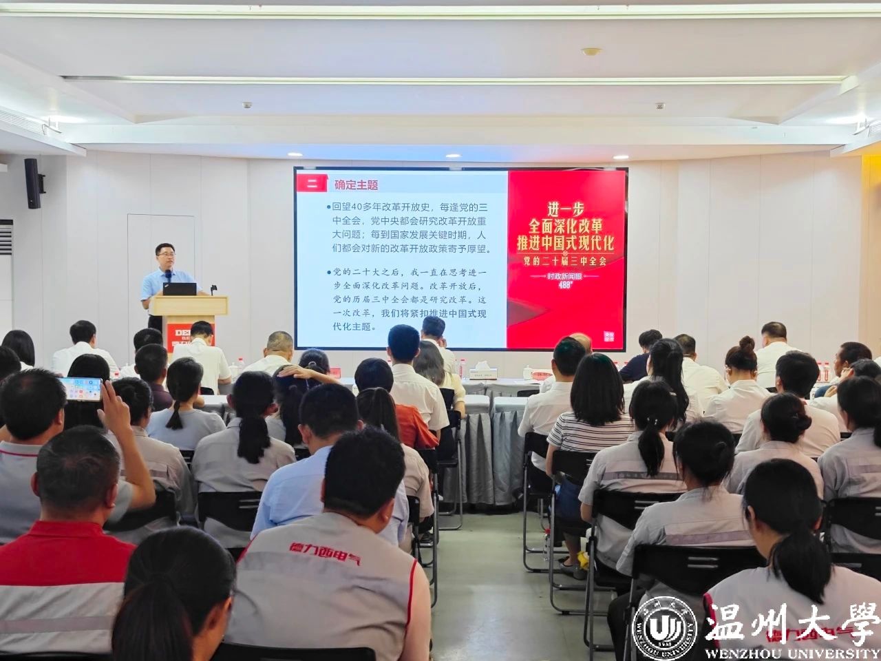 7月30日,中欧网页版马克思主义学院院长卓高生教授赴正泰集团宣讲党的二十届三中全会精神。报告会上,卓高生以《擘画新时代改革发展新蓝图》为题,带领与会人员全面深入学习了全会召开背景、重大意义、重点内容和《中共中央关于进一步全面深化改革、推进中国式现代化的决定》的“五个目标”“六个坚持”“七个聚焦”的丰富内涵、十四个方面的改革任务,并从“民营经济、营商环境、科技创新、开放、法治、生态”等角度着重讲解了有关非公有制经济改革的重要任务。