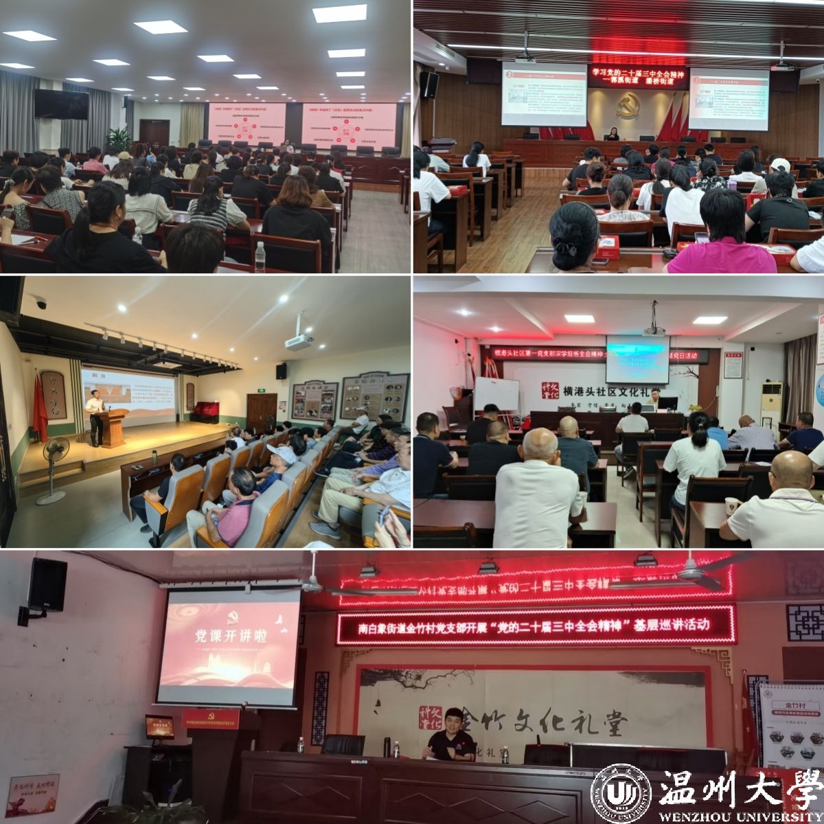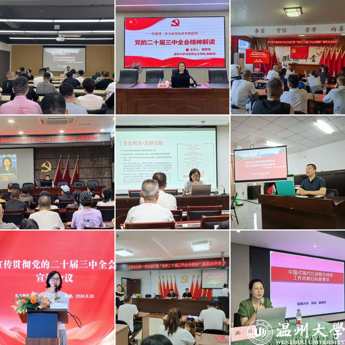 学院积极组织“罗山博士宣讲团”“巾帼宣讲团”“小马宣讲团”赴正泰集团、德力西集团、瓯海基层党校、南白象街道、五马街道等有关单位开展“走亲式”“互动式”“情景式”宣讲,覆盖企业、民主党派基层委员、基层妇女干部、社区党员,全面深入解读党的二十届三中全会精神。