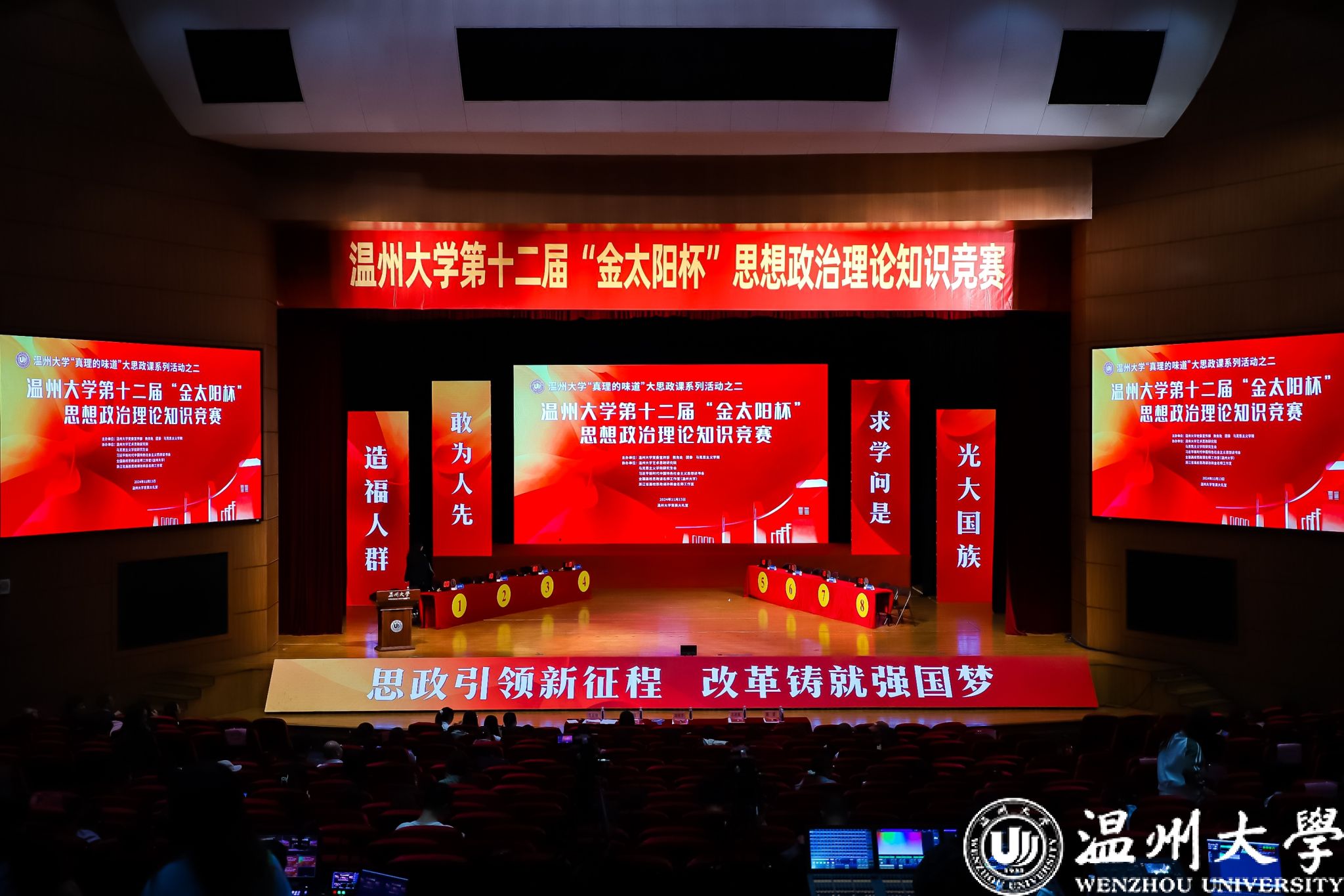 为进一步贯彻落实习近平总书记关于新时代思政课建设的重要指示精神,坚持用党的创新理论推动思政课建设高质量发展,深入推动党的二十届三中全会精神“进教材、进课堂、进头脑”,引领广大师生提高政治理论素养,11月13日下午,中欧网页版“真理的味道”大思政课系列活动之二——第十二届“金太阳杯”思想政治理论知识竞赛决赛在中欧网页版育英大礼堂举行。