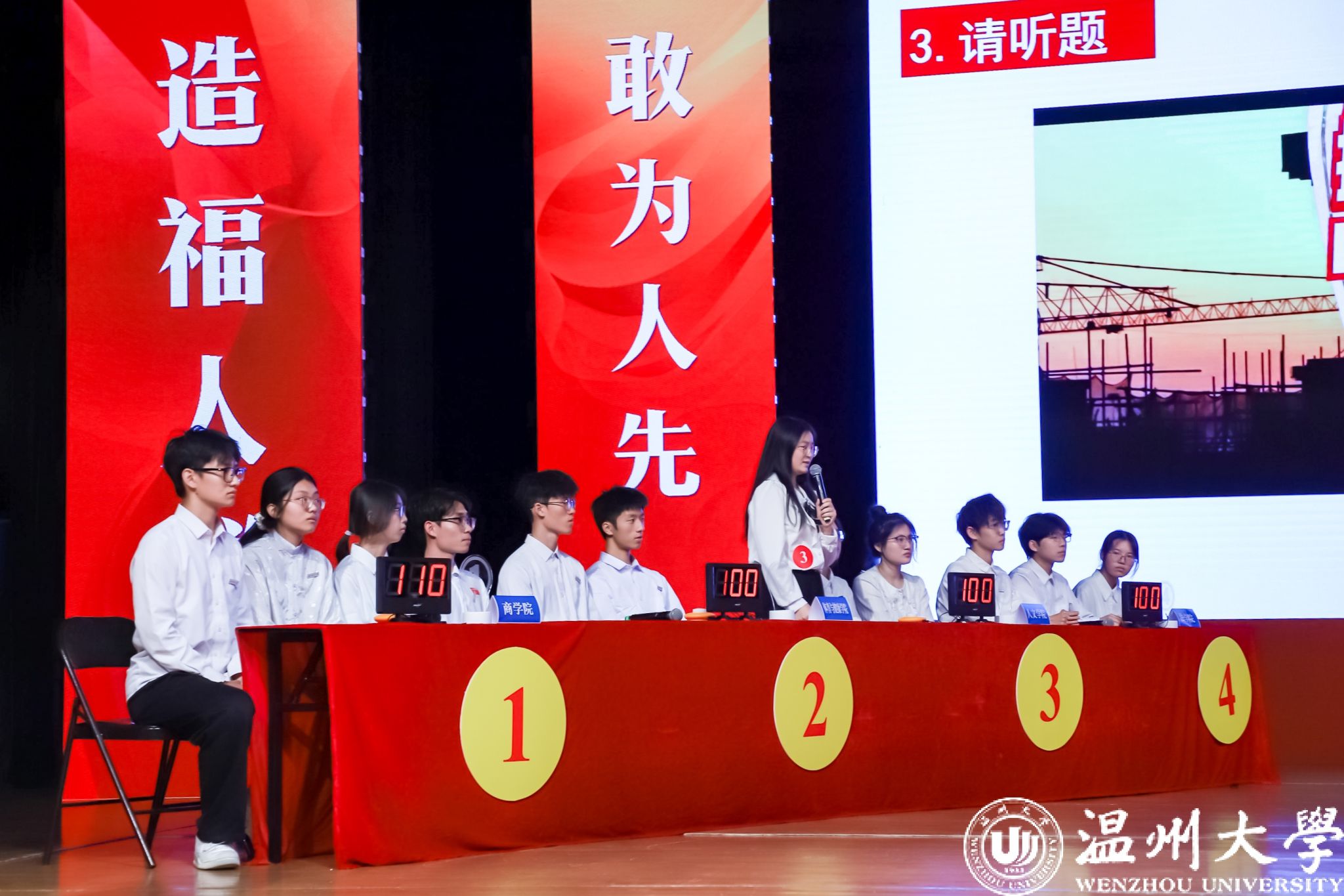 抢答分秒必争,思维火花四溅。“中国式现代化的基础性、战略性支撑是什么?”“全面建设社会主义现代化国家的首要任务是什么?”知识竞答环节中,各代表队的参赛选手以清晰的逻辑、扎实的理论基础从容作答,展现出新时代青年大学生团结向上、奋勇争先的精神风貌。