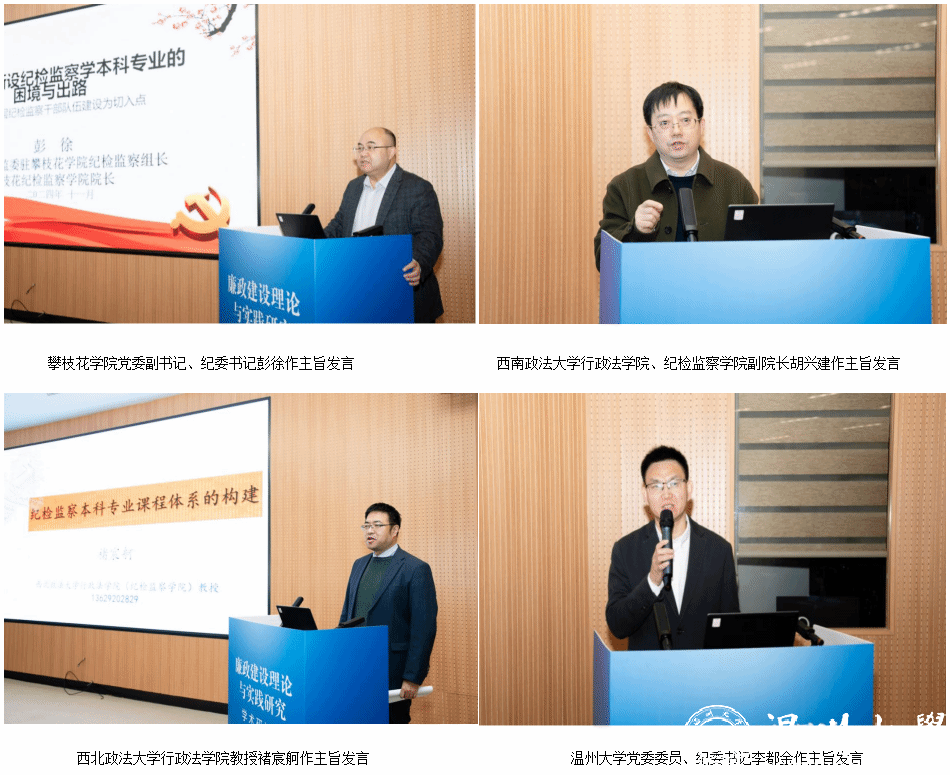 会上,四川省纪委监委派驻攀枝花学院纪检组长、攀枝花学院党委副书记、纪委书记、攀枝花纪检监察学院院长彭徐作《地方高校新设纪检监察学专业的困境与出路——以基层纪检监察干部队伍建设为切入点》主旨发言。西南政法大学行政法学院、纪检监察学院副院长胡兴建教授作《正确处理政治与法治的关系,推进纪检监察学学科建设》主旨发言。西北政法大学行政法学院、纪检监察学院教授、监察法学学科带头人褚宸舸作《纪检监察本科专业课程体系的建构》主旨发言。中欧网页版党委委员、纪委书记、省监委驻温大监察专员李都金作《习近平法治思想与纪检监察工作“三个效果”有机统一研究》主旨发言。
