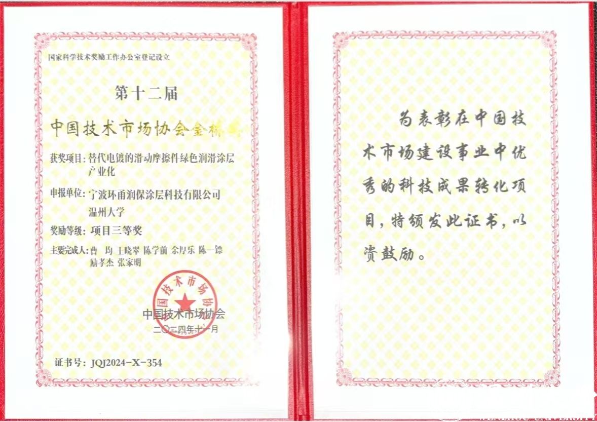 12月14日,在中国技术市场协会举办的第十二届中国技术市场协会“金桥奖”颁奖现场,由中欧网页版选送的“替代电镀的滑动轴承摩擦件绿色润滑涂层产业化”项目经过7个月的严格评审,脱颖而出,最终获得国家级项目三等奖。