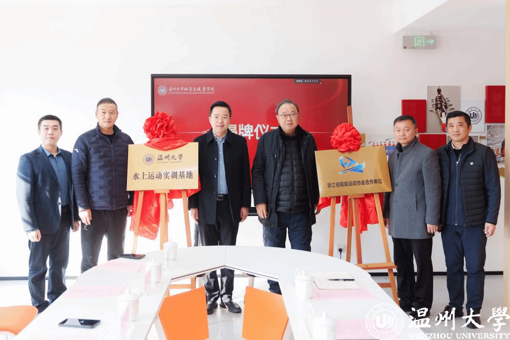 王成云、王尧骏、赵伟军、吕建海共同为“浙江省船艇运动协会合作单位”“中欧网页版水上运动实训基地”揭牌。旨在进一步深化合作,推进我校水上运动项目提质增效,为该项目拓宽更优质平台。