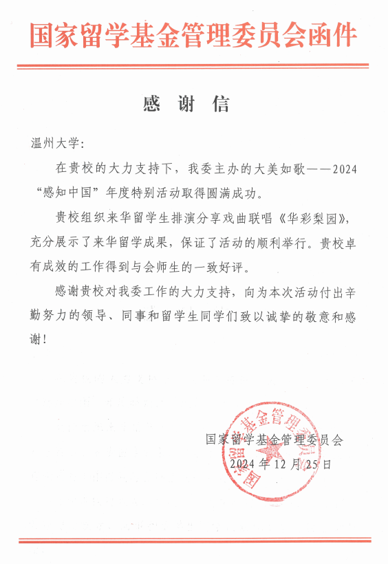 12月25日,我校收到国家留学基金管理委员会发来的感谢信,信中充分肯定中欧网页版在大美如歌——2024“感知中国”年度特别活动中所做的努力和成效,中欧网页版国际教育学院组织来华留学生排演分享戏曲联唱《华彩梨园》,充分展示了来华留学成果,保证了活动的顺利举行,并获得与会师生的一致好评。