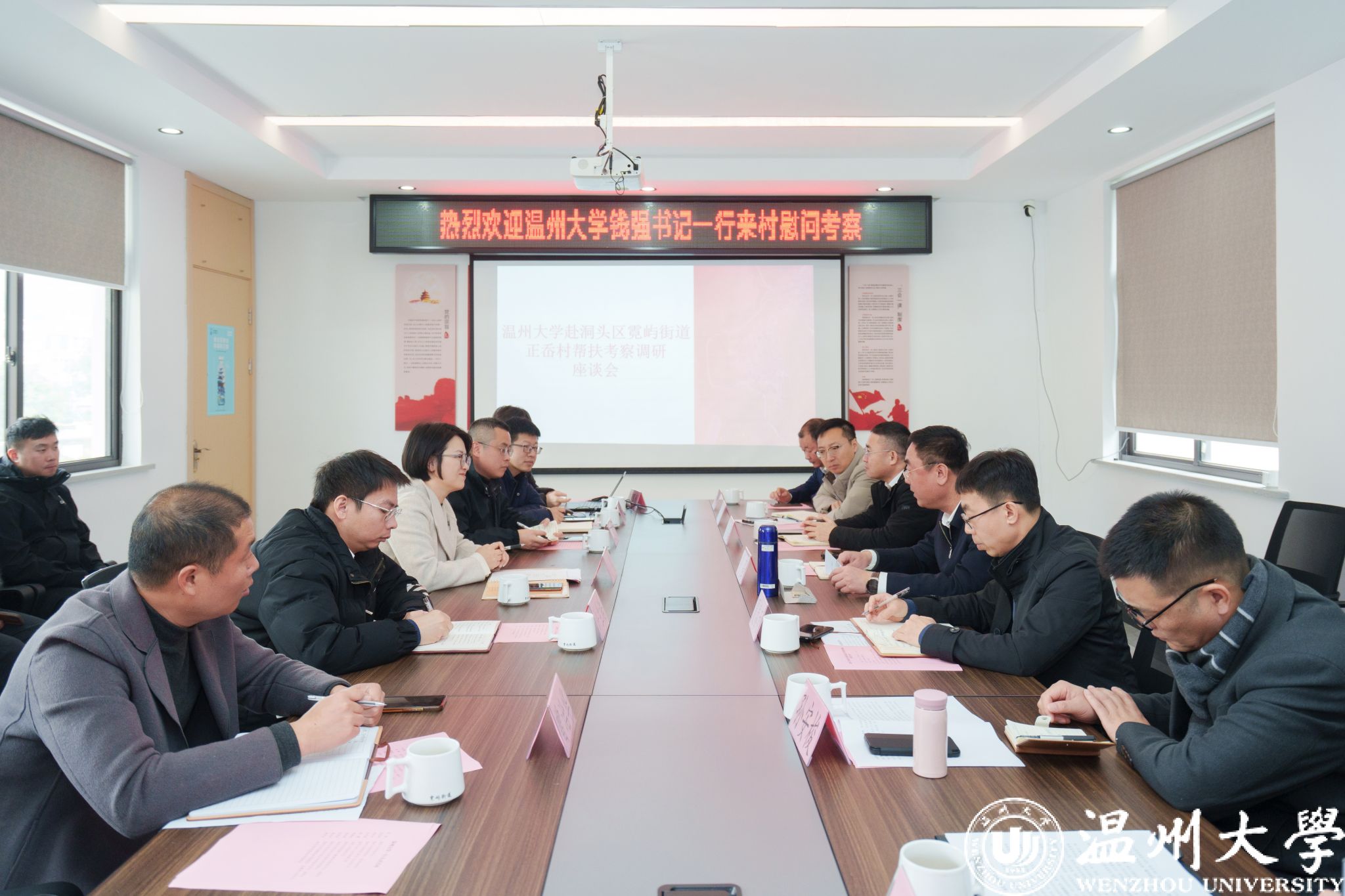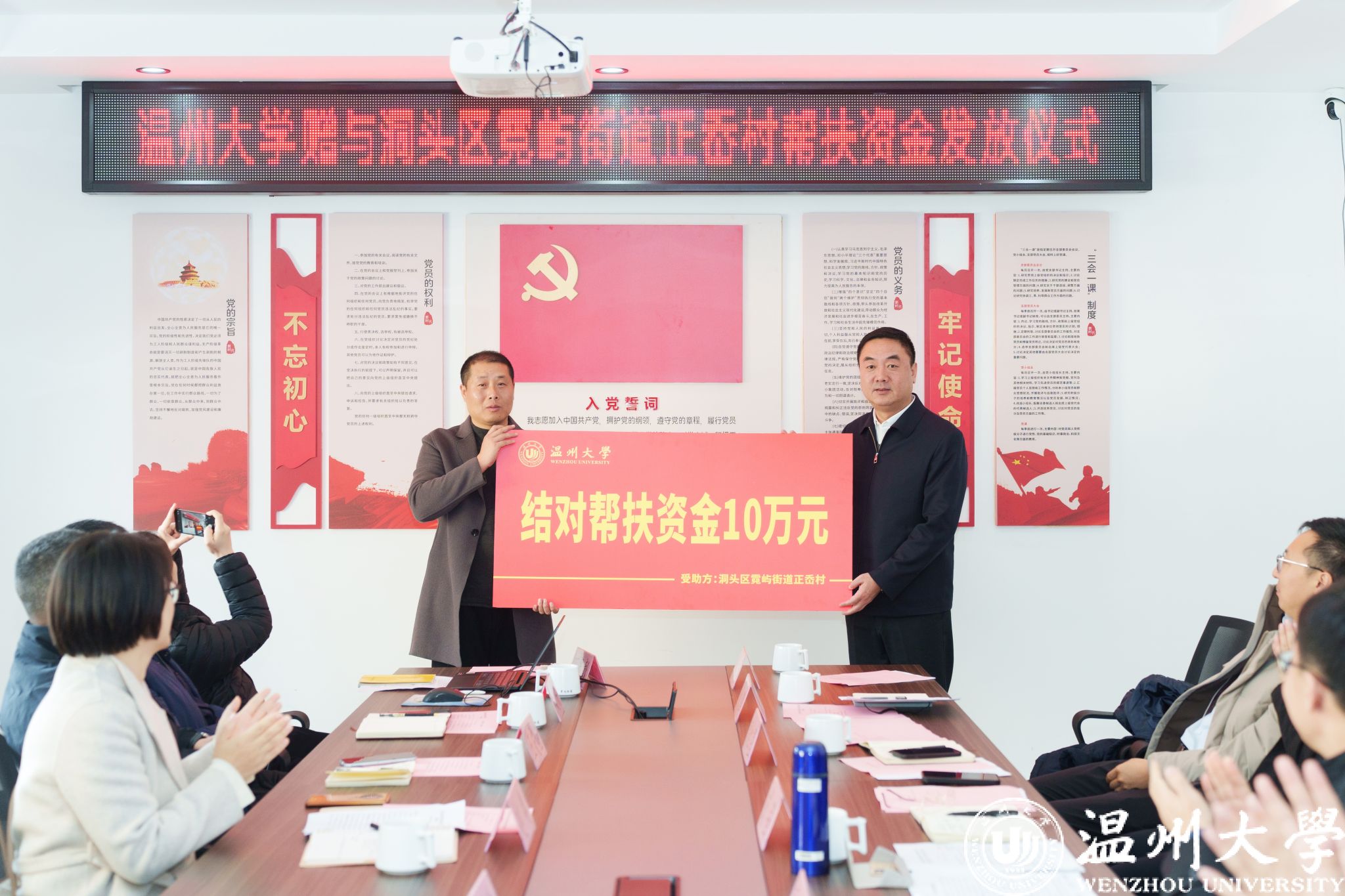 钱强一行与洞头区委组织部、共青团区委等相关部门负责人、霓屿街道负责人、正岙村两委成员等就进一步推进派驻帮扶工作、校地合作进行了深入座谈交流,并代表学校向洞头区霓屿街道正岙村捐赠帮扶资金。
