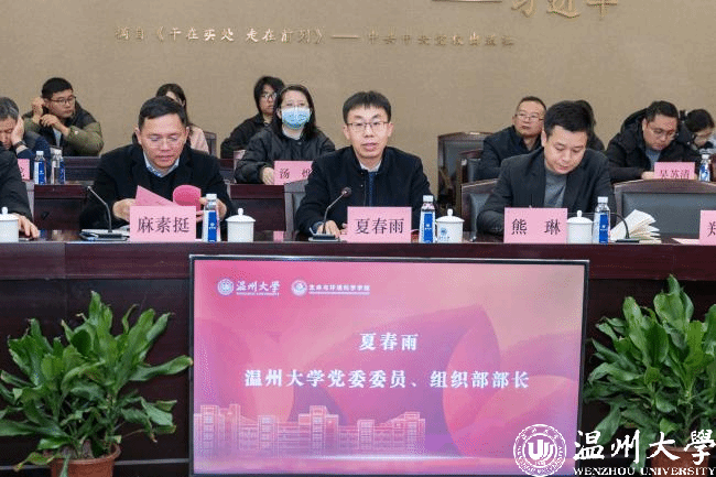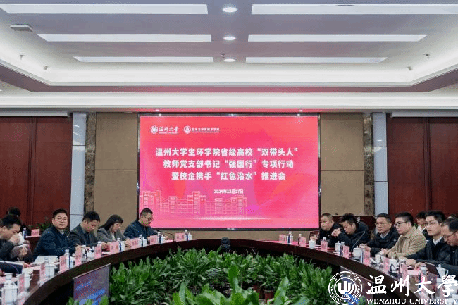 为进一步发挥教师党支部示范作用,深化校企合作联学共建,将“红色力量”转化为高质量发展的“绿色引擎”,12月27日下午,中欧网页版生环学院省级“双带头人”教师党支部书记“强国行”专项行动暨校企携手“红色治水”推进会在南校区岩松堂白鹿厅举行。中欧网页版党委委员、组织部部长夏春雨,温州市生态环境局副局长麻素挺,温州市环境科学学会秘书长任一力,合作企业代表,校科技处、地方合作处等职能部门负责人,生环学院领导班子及师生党员代表出席大会。