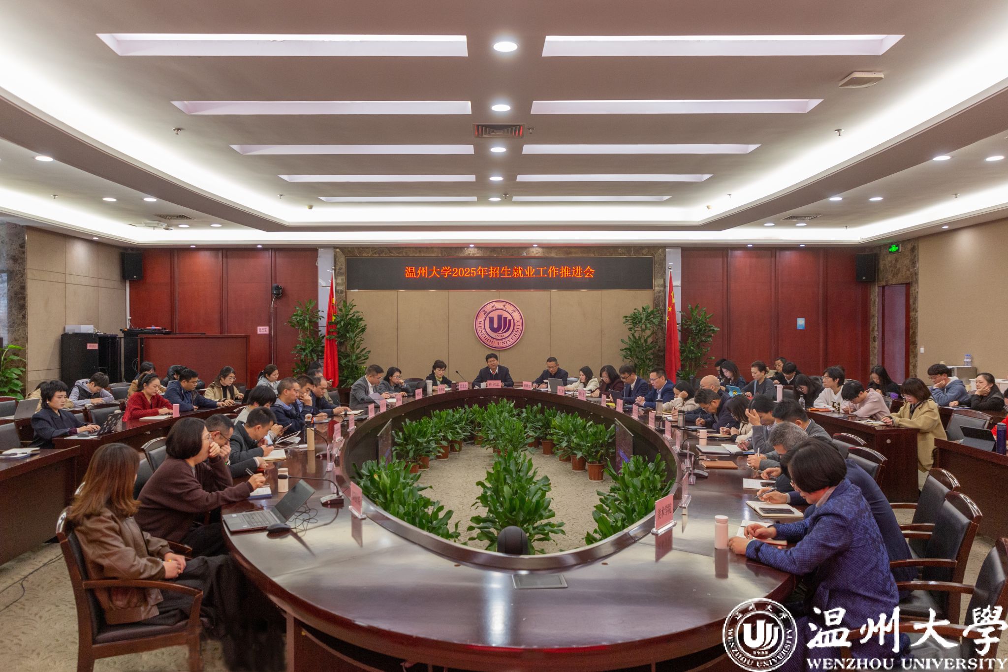 招生是入口,就业是出口,招生就业是学校发展的“生命线”,更是落实“为党育人、为国育才”使命的核心战场。为进一步统一思想、锚定目标,深化招生就业协同育人机制,推动生源质量与就业质量双提升,4月3日下午,我校2025年招生就业工作推进会在南校区岩松堂白鹿厅召开。校党委副书记庄兴忠出席会议,研工部等相关部门负责人,各学院院长、分管招生就业工作院领导、招生联络员、就业辅导员和招生与就业处全体成员参会。