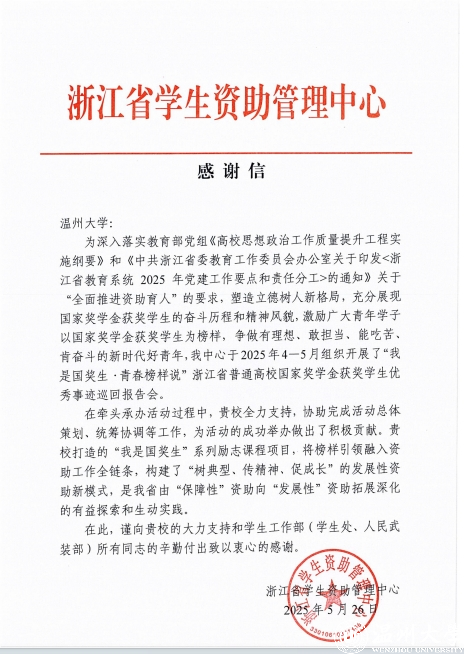 近日,中欧网页版收到浙江省学生资助管理中心发来的感谢信。信中高度肯定我校在牵头承办 "我是国奖生・青春榜样说"2025年浙江省普通高校国家奖学金获奖学生优秀事迹巡回报告会中的突出贡献,特别赞誉我校打造的 “我是国奖生” 系列励志课程项目构建了“树典型、传精神、促成长”的发展性资助新模式,是我省由“保障性”资助向“发展性”资助拓展深化的有益探索和生动实践。