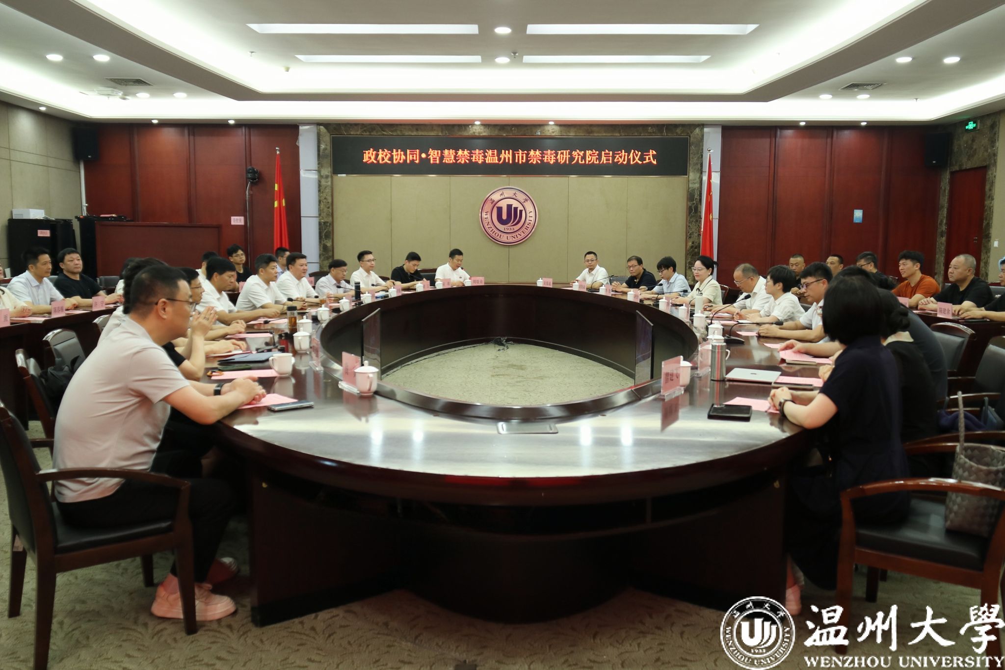 6月26日,时值第38个国际禁毒日,由中欧网页版、温州市公安局、瓯海区公安分局三方合作共建的综合性智库研究基地——温州市禁毒研究院启动仪式在中欧网页版岩松堂白鹿厅举行。中欧网页版党委副书记庄兴忠,浙江省禁毒办副主任、浙江省公安厅禁毒总队副总队长周永盛,温州市公安局副局长徐良悟,瓯海区副区长、瓯海区公安分局局长张杰尔,温州市公安局禁毒支队支队长章贤,西南政法大学毒品问题治理研究中心主任梅传强教授、副秘书长胡江副教授,温州禁毒法学会会长吴之欧教授以及全体理事出席。