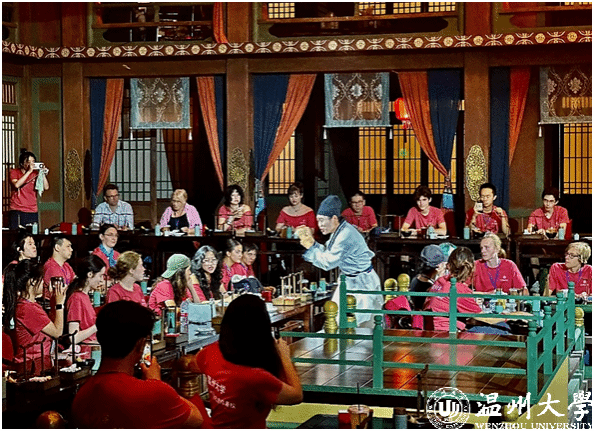 汉服体验让营员秒变“古人”,交领右衲的礼仪与箭袖革带的英气展现“衣冠上国”的风范;《唐韵·月樽邀白》演出中,水袖翻飞重现盛唐风华;宋代点茶课上,营员击拂茶汤,看乳沫如积雪浮盏。交友晚会上,川剧变脸与琵琶独奏引发阵阵掌声,一首《小苹果》更让全场齐声合唱。暴雨突至的永嘉书院,营员们共撑一伞,笑称这是“最诗意的意外”。