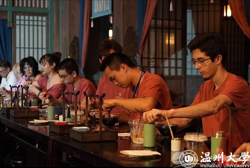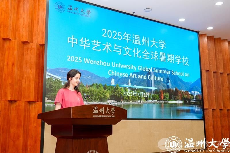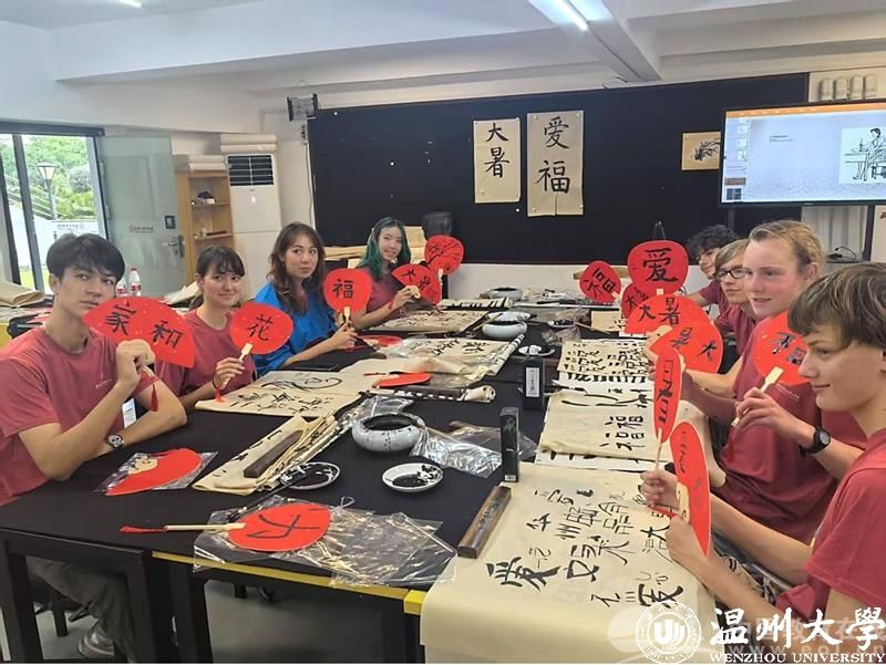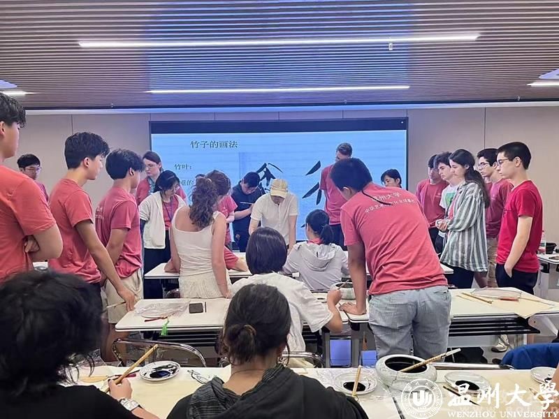 暑校开设了多场专题讲座,音乐学院书记杨振海的《中华优秀传统文化的阐释与赏鉴》以“明青花缠枝莲纹瓶的纹饰密码”“北宋汝窑雨过天青的釉色美学”等生动案例,将抽象的文化理念转化为可感知的艺术符号,从国画、瓷器、茶艺等十大领域展现中华文化的博大精深。美术与设计学院书记刘青松则在胤秀文化温州影视基地通过摄影艺术中“留白如诗”的构图原则和“阴阳相济”的光影运用,带领营员感悟摄影中“天人合一”的东方美学理念。中国书法课堂上,高玥老师从王羲之《兰亭集序》的飘逸到颜真卿楷书的雄浑,现场示范“气韵生动”的笔墨技法。水墨画课程中,梁腾老师一步步拆解画竹的“中锋行笔”与“分组勾勒”,让营员在淡墨浓彩间体会“书画同源”的深意。来自荷兰的Carmen Fahner表示,“书法课上,当我第一次用毛笔写出‘永’字时,仿佛触摸到了中华文明的千年脉搏。”