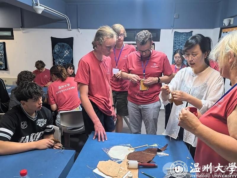 营员们在皮具DIY课堂上从裁皮、缝线到打磨,完成专属卡包。剪纸课上,张丽丽老师以“乐清细纹刻纸”技艺带领学员解码古代瓯人祈福密码,将红纸化作帆布包上的现代纹样。蓝染体验中,叶茜老师指导营员用棉线扎出冰裂纹,浸染出独一无二的蓝白图案。活字印刷课上,学员们将亲手印刷的诗句制成蓝夹缬风铃,叮咚声中回荡着古老技艺的现代回响。美国营员杰克在总结会上展示自制的蓝染方巾,“我要把它挂在宿舍,告诉更多人中国非遗的故事。”