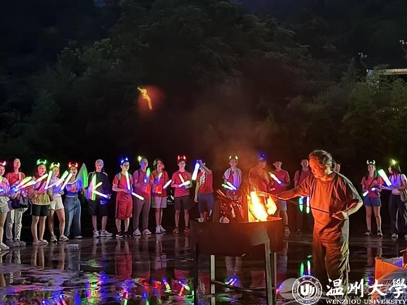 台风“丹娜丝”未能阻挡文化之约。工作人员冒雨接机,用毛巾和雨具为营员筑起第一道温暖防线。行程中,走进文成刘基故里与刘基庙,仿佛开启了一场跨越六百年的历史对话。雁荡山灵峰的“移步换景”让营员读懂“天人合一”的东方智慧。大龙湫瀑布下,197米落差的飞瀑成为“师法自然”的生动课堂。瓯江夜游时,山体灯光秀将温州从“东瓯古国”到“现代商都”的历史长卷映照江面。篝火晚会上,舞龙舞狮与打铁花表演引得全场欢呼,营员们与村民共舞,在火光中体验“团结共生”的民俗智慧。加拿大华裔李潇潇在芙蓉古村触摸卵石巷道时动情地说:“长辈口中的故乡,此刻就在我脚下。”