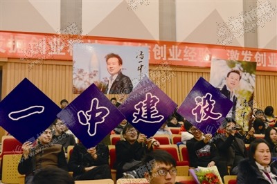 竖立在会场门口的大幅喷绘,上面是15位青年创业楷模的大幅照片及创业经历,从他们选择创业的行业到一路创业的艰辛都一览无余。这面喷绘墙也成了会场内外的焦点,吸引了一拨又一拨大学生驻足浏览,就连提早到场的几位楷模,都忍不住留步在这面喷绘墙前留个影以作纪念。