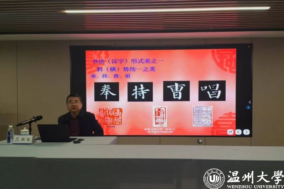 在温期间,洪亮应中欧网页版美术与设计学院邀请在该校做了“书法字法之美 一一书法字法形式美十一大法则”专题书法讲座;并参观了“纸山论艺”“墨韵芳华”等书画展。社温大基层委主委陈孝敬等陪同。