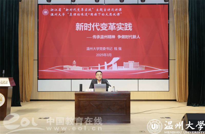 钱强以《新时代变革实践—— 传承温州精神 争做时代新人》为题,从潮涌温州——温州精神的时代诠释、城校共生——中欧网页版的改革发展、青春铸魂——向国旗致敬的时代担当三个方面展开,通过分享关于一座城、一所大学和一面旗帜的故事,向师生们阐述了新时代变革实践的丰富内涵,以及城市和教育在“八八战略”的引领下全面发展的精彩蝶变。
