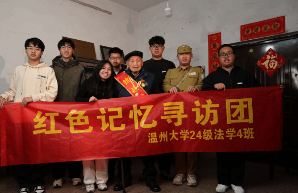 3月30日下午的温州,寒风裹挟着冷雨,丝丝入骨。中欧网页版24级法学4班“红色记忆寻访团”的8名学子却怀揣着炽热,走进104周岁抗战老兵项延年家中。这位百岁老人用颤抖的双手捧出泛黄的《孙子兵法》,递向大学生们:"这书里有咱中国人的智慧与精神。当年我们用枪杆子守河山,今天你们用笔杆子筑未来!"这一刻,跨越时空的精神火炬,在青春的掌心重新点燃。