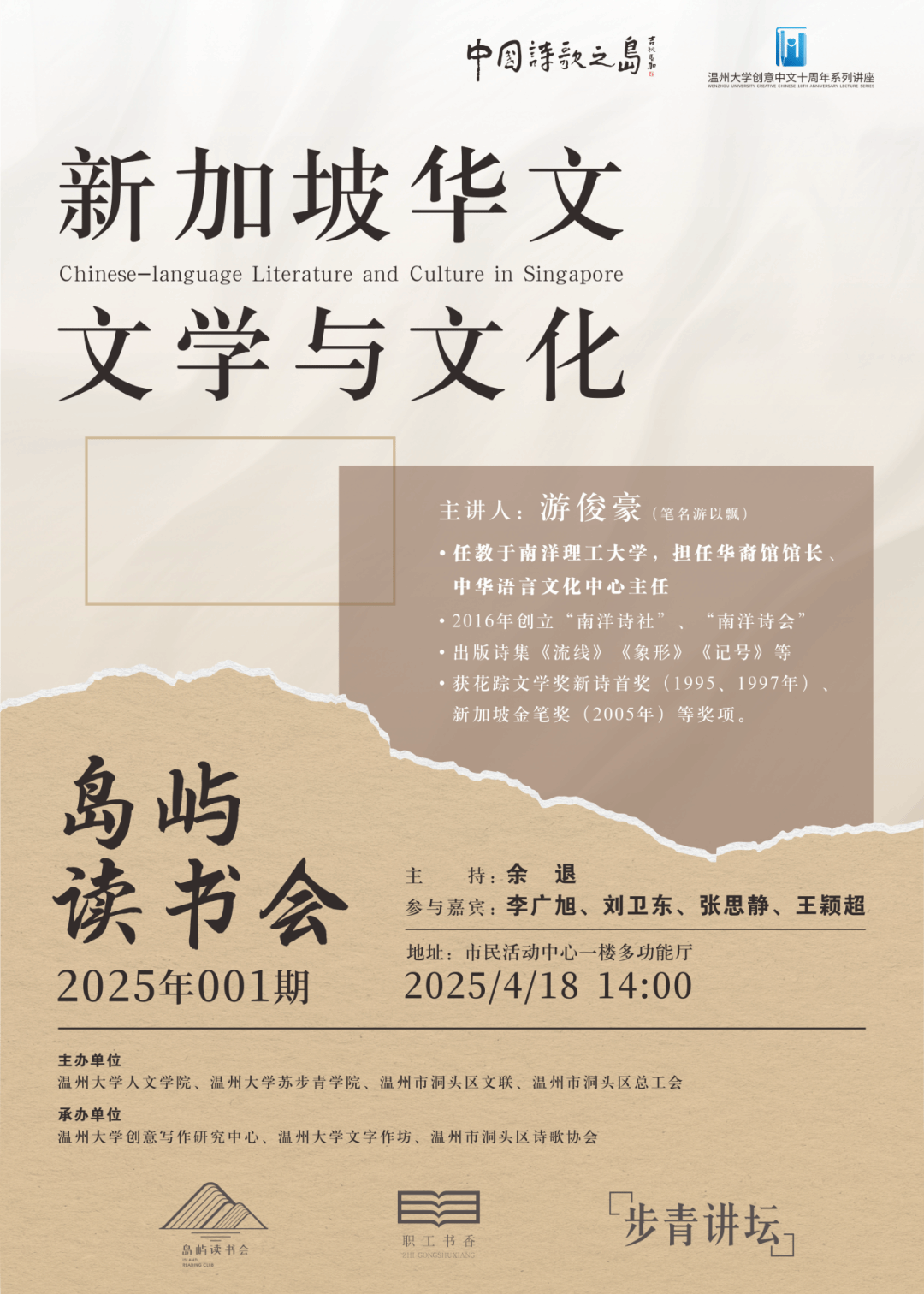 在“世界读书日”即将到来之际,4月18日,温州市洞头区首期“岛屿读书会”在区市民活动中心隆重举行。本次活动以“新加坡华文文学与文化”为主题,由温州市洞头区文联联合中欧网页版人文学院、区总工会等多家单位共同主办,标志着洞头这座“中国诗歌之岛”再添文化盛事。